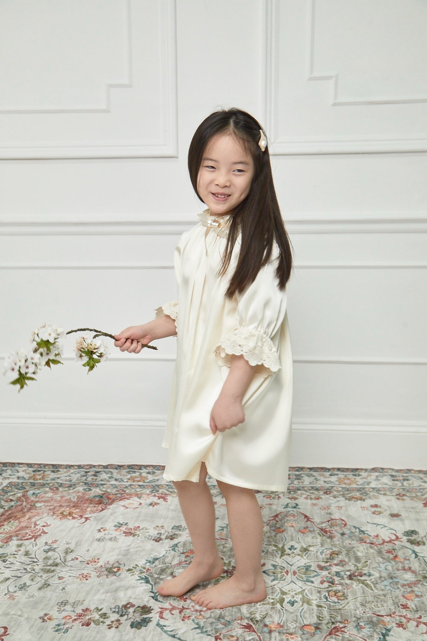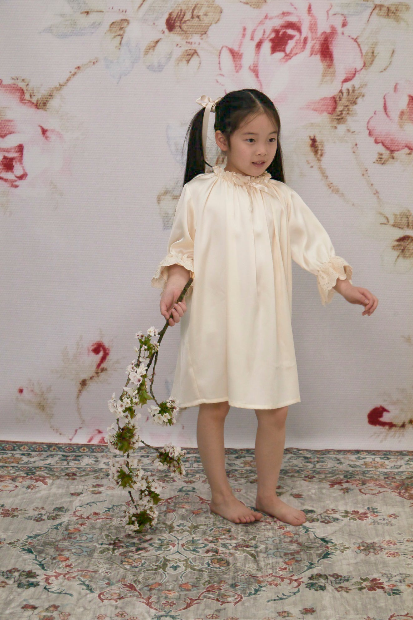 This traditional style nightdress is a true classic. Made with our luxury satin, ruffled neck line with Ivory bow detail. The arms are made to style as a 3/4 length bloomer arm, giving it that true vintage feel, finished off with our signature lace cuff. Spider Lily is extremely comfortable and soft to touch.